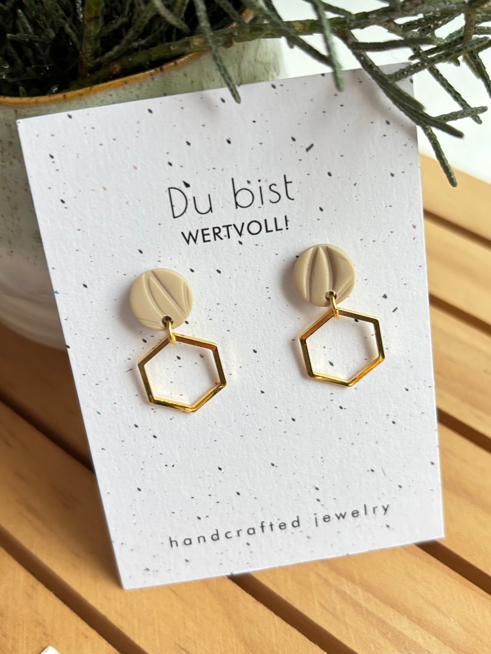 Mit Blütenmuster bedruckte Stecker aus Polymer mit vergoldeten Hexagonanhängern.
