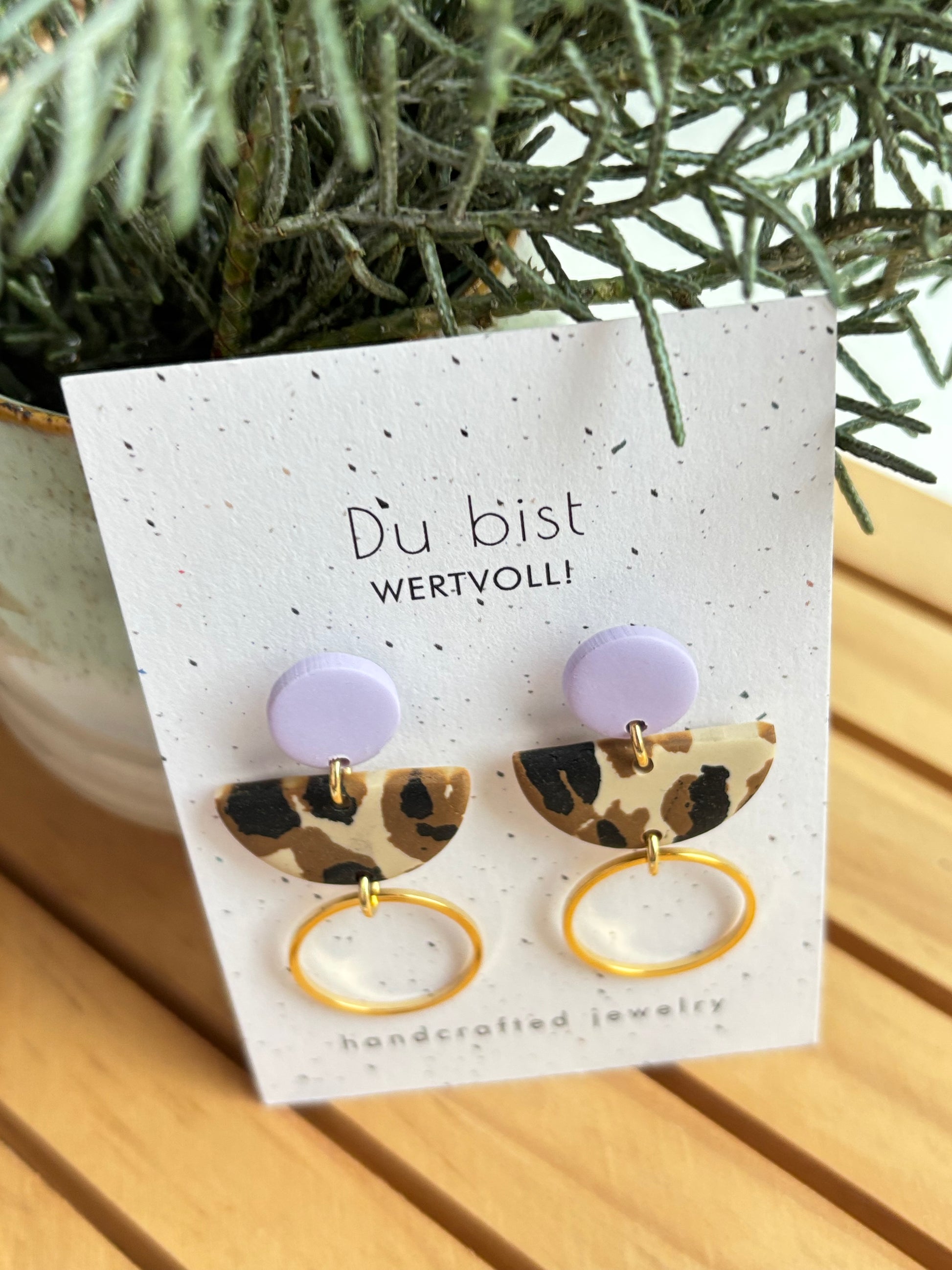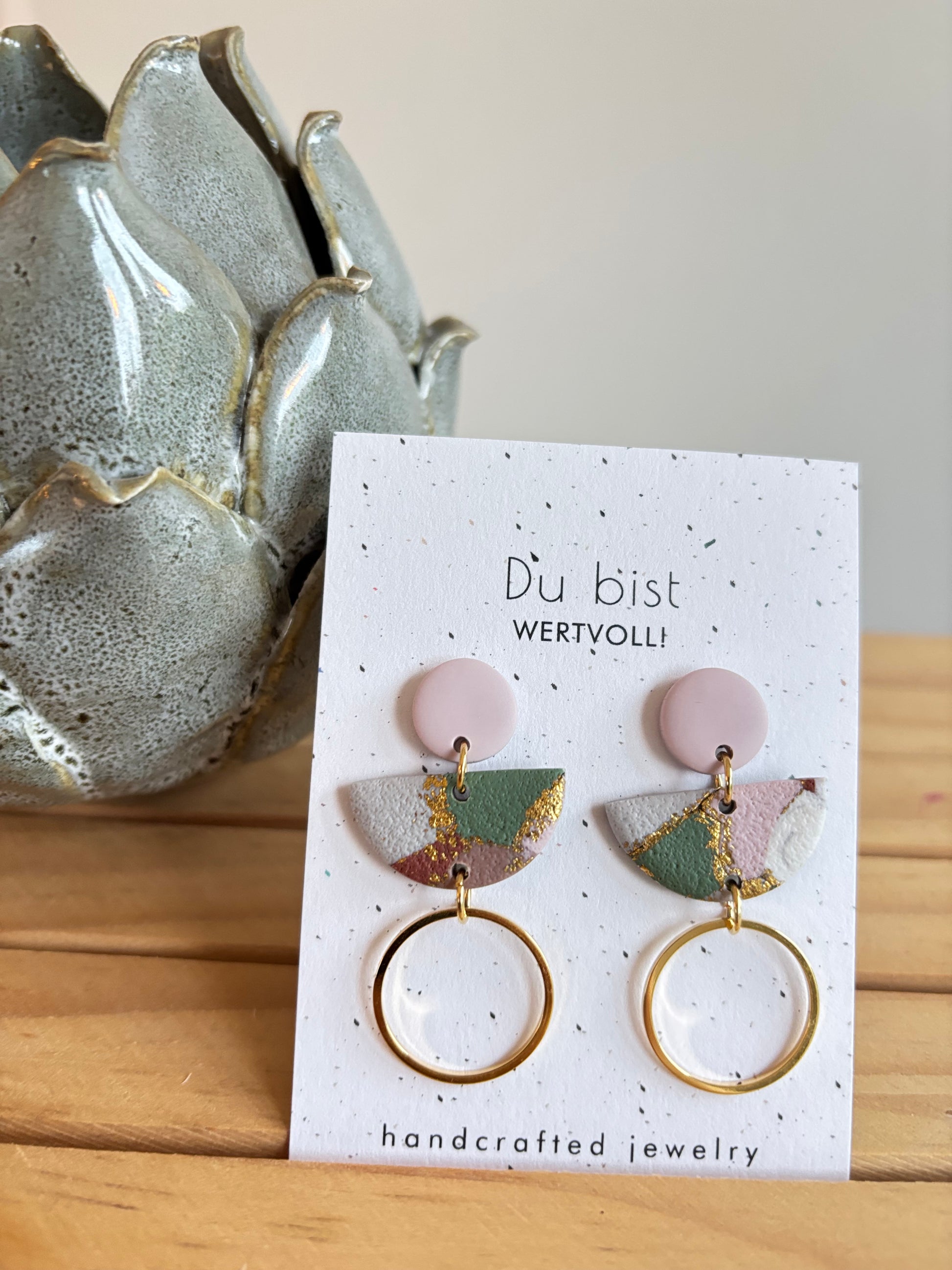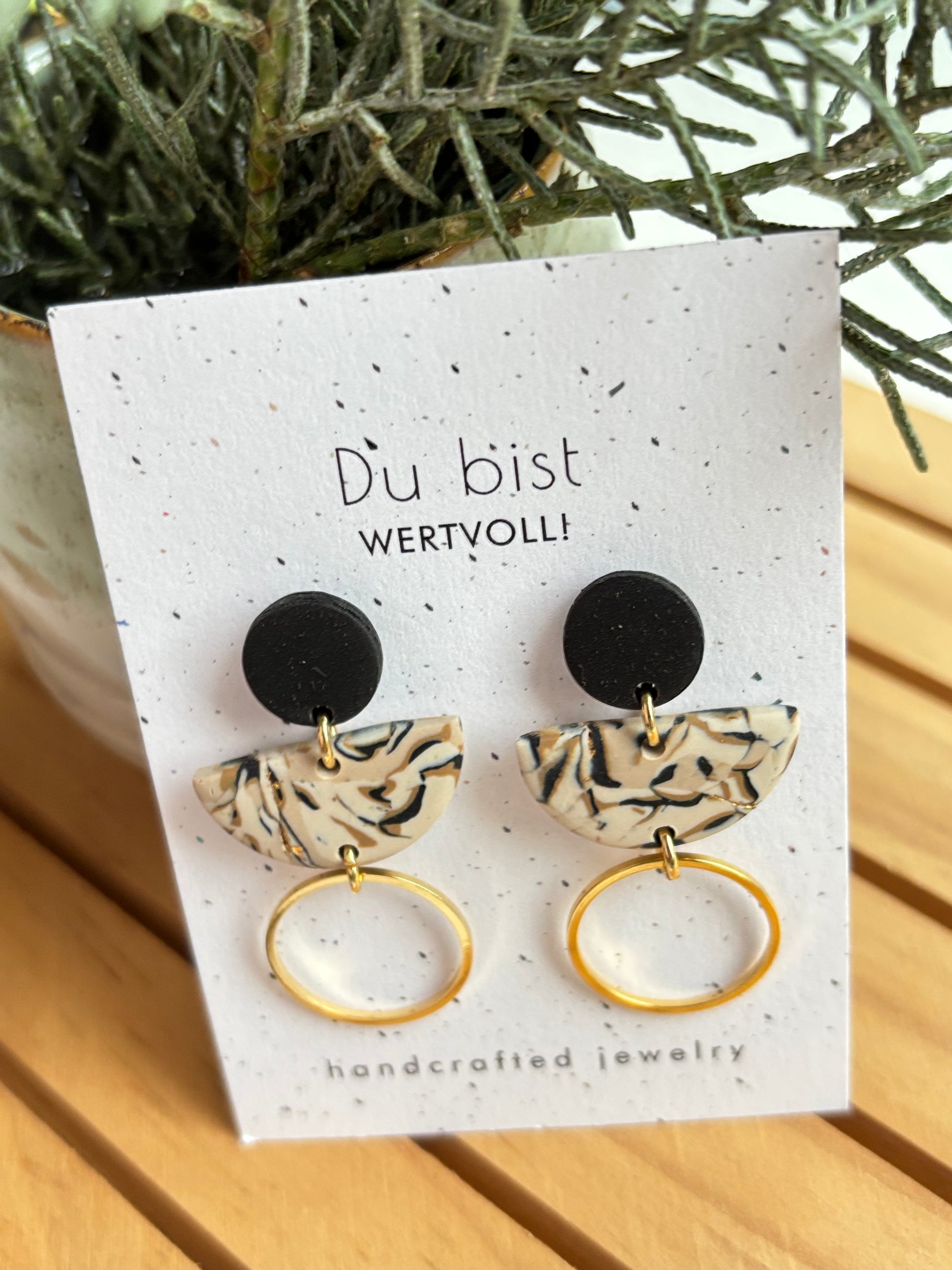 Polymerdots mit Halbmonden und vergoldeten, runden Anhängern an einem gut verträglichen Edelstahlstecker.